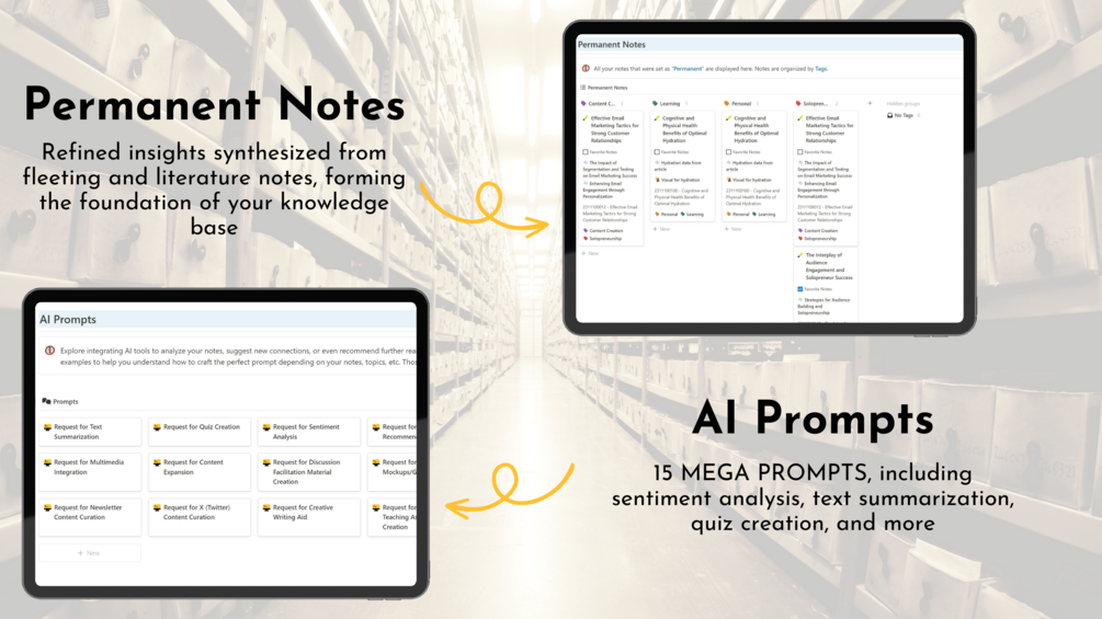- Leverage the power of AI with 15 mega-prompts designed to analyze your notes, uncovering insights you might have missed (sentiment analysis, summarization, and more).
