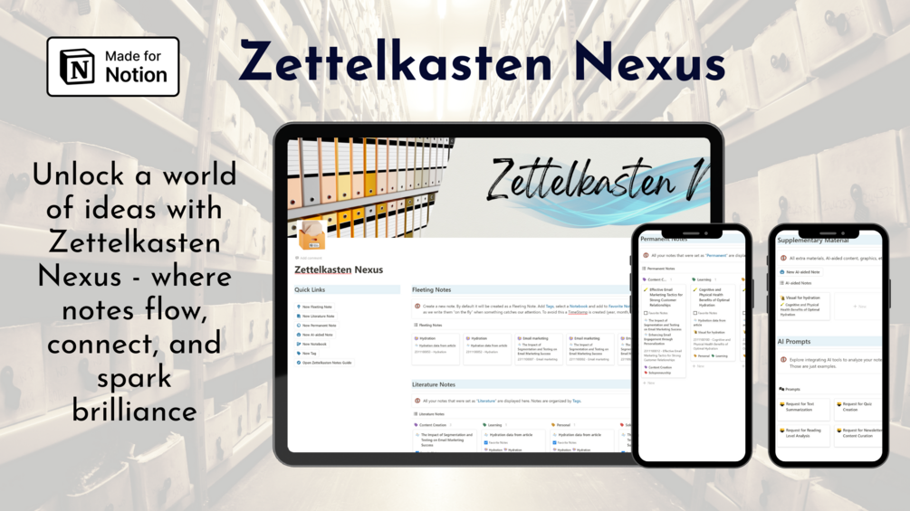 Build a dynamic knowledge network with the Zettelkasten Nexus Notion template. This AI-enhanced template, based on the proven Zettelkasten method, helps you capture, connect, and analyze ideas with dedicated databases and prompts. Perfect for anyone seeking to unlock the full potential of their notes.